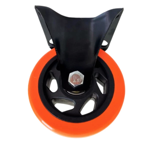 Construção robusta – Roda em PVC laranja com núcleo de polipropileno preto e rolamento duplo de esferas, oferecendo movimentação suave e estável.